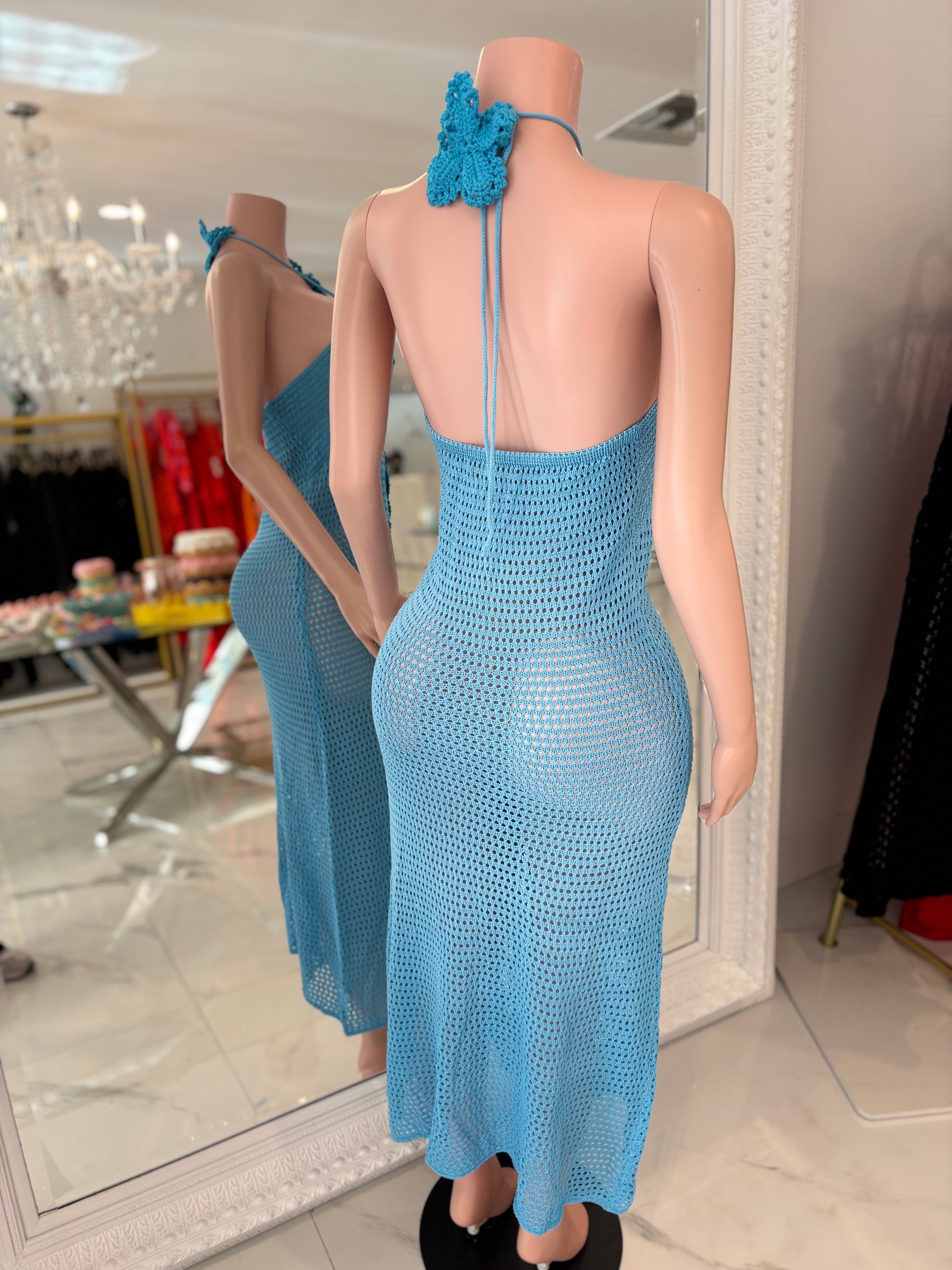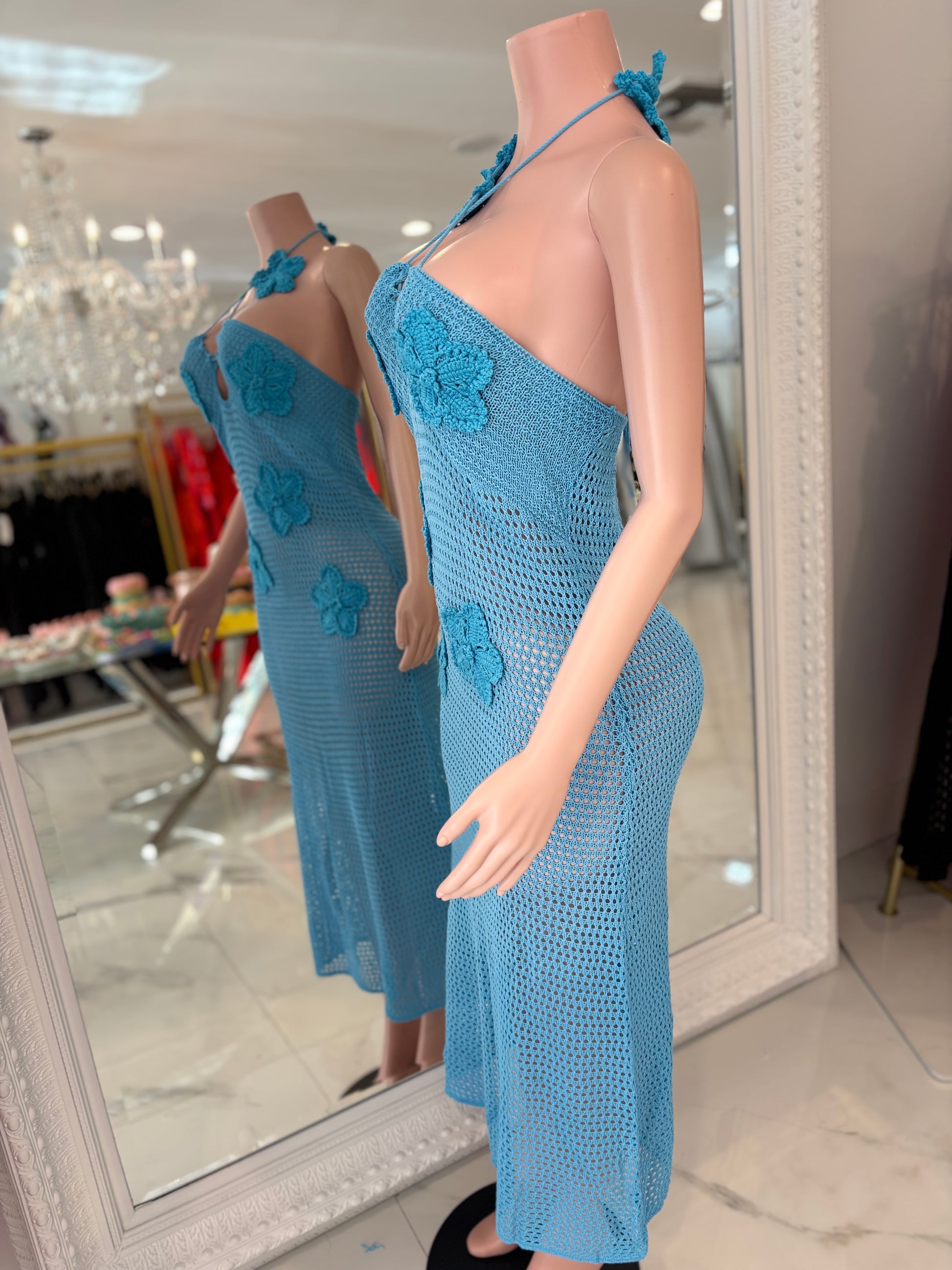 Seafoam Garden Floral Crochet Maxi Dress Blue