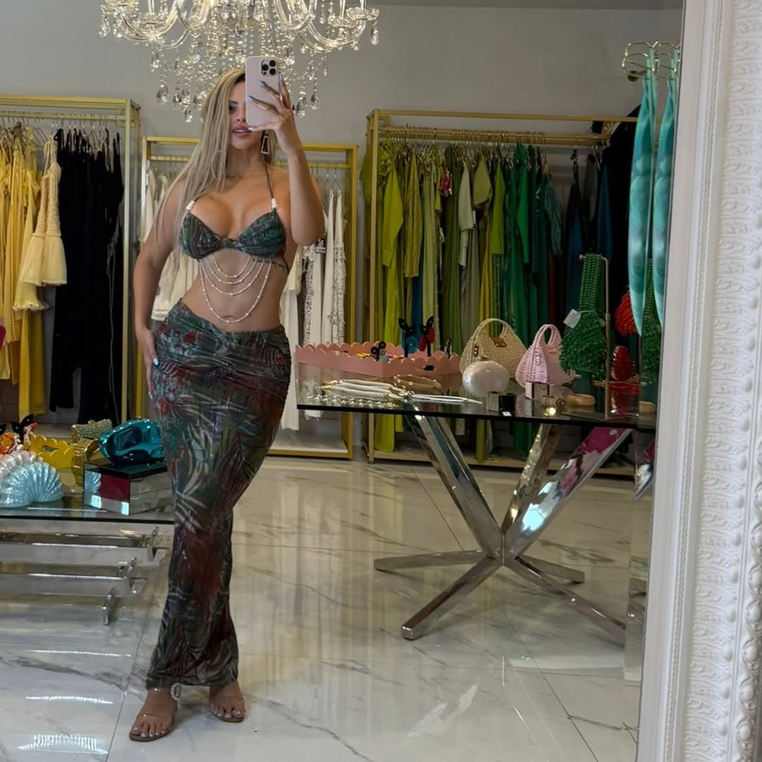 Jungle Mirage Pearl Mesh Ruched Skirt Set Green