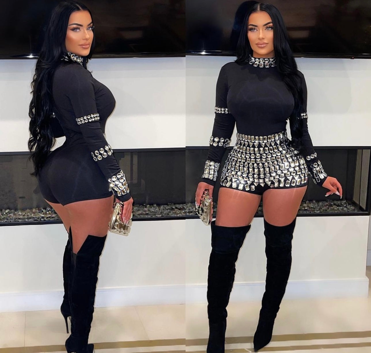 - Model wearing 4" heels